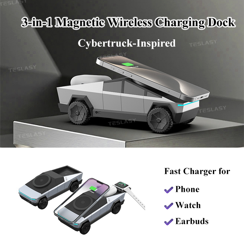 Teslasy CyberDock 3-In-1 Wireless Charging Station with Cybertruck Model Design | Fast Mag-Safe Charger for iPhone iWatch AirPod
