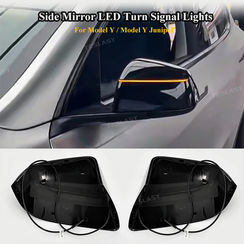Upgrade your Tesla Model Y's style and safety with Teslasy Side Mirror LED Turn Signals, featuring sequential amber lighting, smart AP and blind spot alerts, and seamless integration.